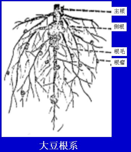 大豆根的形態特征,大豆根系由主根、枝根(側根)、根毛組成。初生根由胚根發育而成,并進一步發育成主根。枝根在發芽后3-7天出現,根的生長一直延續到地上部不再增長為止。在耕層深厚的土壤條件下,大豆根系發達,根量的80集中在5—20cm土層內,主根在地表下10cm以內比較粗壯,愈向下愈細,幾乎與枝根很難分辨,入土深度可達60-80cm。枝根是從主根中柱鞘分身出來的,一次枝根先向四周水平伸展,遠達30-40cm,然后向下垂直生長。一次枝根還再分生二三次枝根。根毛是幼根表皮細胞外壁向外突出而形成的。根毛壽命短暫,大約幾天更新一次。根毛密生使根具有巨大的吸收表面。(一株約100㎡)