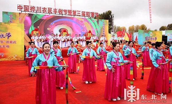 活動現場彩虹門上方寫有“中國樺川縣農民豐收節暨第三屆稻香節”的醒目大字金碧輝煌,格外搶人眼球。果蔬造型、稻谷彩車、民族特色壁畫,鄉村濃郁新貌的展示,處處彰顯五谷豐登、六畜興旺的豐收景象。