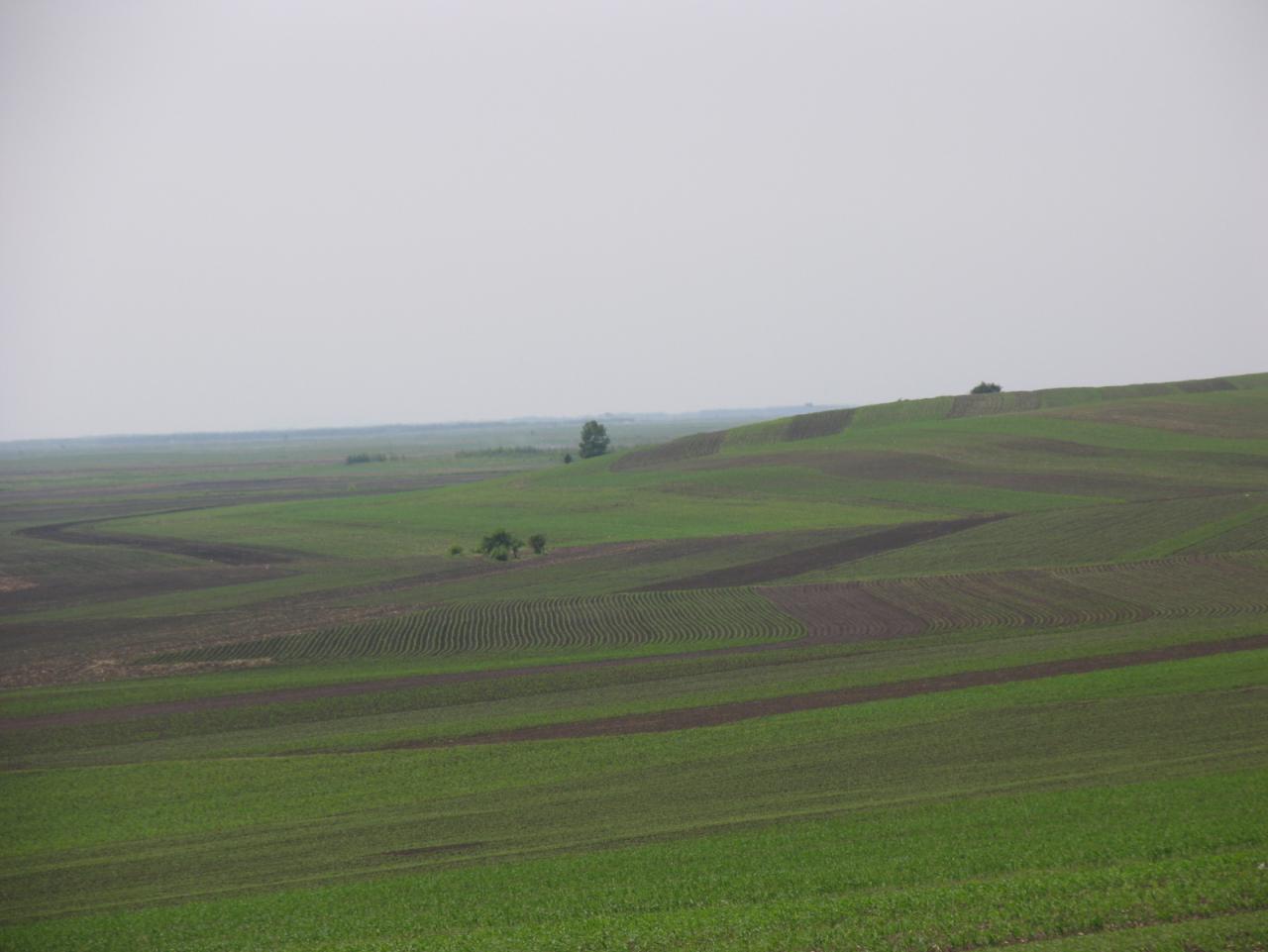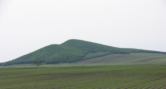 在黃書(shū)記的帶領(lǐng)下,我們驅(qū)車沿著曲曲彎彎的鄉(xiāng)路來(lái)到對(duì)錦山西部的高崗上。只見(jiàn)對(duì)錦山兩座南北并列的漫圓狀山頭突兀而起,郁郁蒼蒼;山下大地平坦如砥,一望無(wú)垠;高崗西部臥著兩道南北漫崗,逶逶迤迤同南部平原相連。正是5月播種的季節(jié),大地地成垅,田成方,一片片綠油油的小苗充滿生機(jī)。