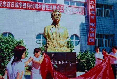 2005年8月15日,在紀(jì)念抗日戰(zhàn)爭勝利60周年時(shí),富錦一中于藝術(shù)館前落成張進(jìn)思半身塑像。時(shí)為中共富錦市委常委、統(tǒng)戰(zhàn)部長馬冬梅和政協(xié)副主席脫秀彬?yàn)樗芟窠夷唬恢腥w師生參加了揭幕典禮。