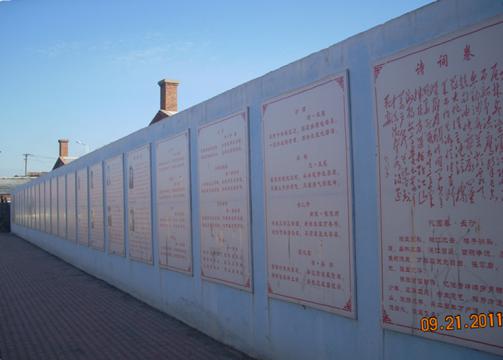 長廊后身是長達50余米鑲嵌著26塊牌匾的文化墻,由卷首語、詩詞卷、楷模卷、精英卷、故事卷、書畫卷、百廉圖、廉政廣告等組成了琳瑯滿目的文化長卷。詩詞卷由毛主席和中國古代秋瑾、李白、王冕、鄭燮、龔自珍等12位詩人的愛國明志、詠物抒懷詩詞組成;楷模卷展示了焦裕祿、王進喜、雷鋒、王瑛、任長霞、包拯、海瑞、文天祥的畫像和簡歷;精英卷介紹了在富錦的民主主義革命時期涌現出來的張進思、于天放、祁致中、李景蔭、呂慶芳、常隆基等抗日英雄的光輝事跡;故事卷收集了周恩來總理、朱德總司令以及明朝嘉興太守楊繼宗、清朝乾隆進士王杰、北周衛州治中趙軌、唐朝宰相盧懷慎的廉潔自律故事;書畫卷是由富錦的藝術工作者創作的以廉政為內容的書法、美術、剪紙等作品。