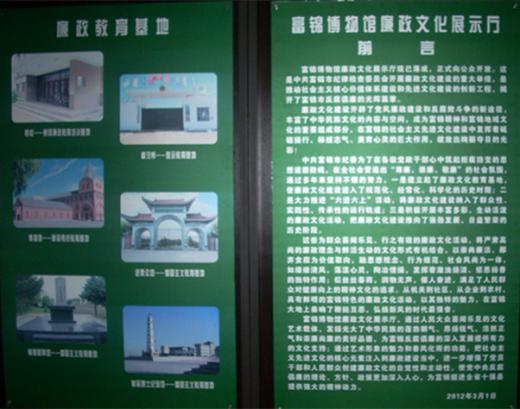 廉政文化教育基地展板,展示的是由黨校、監所、廉政網、大講堂、革命遺址等組成的廉政文化網絡。這個網略承載著開展革命傳統教育,傳播社會主義核心價值體系的功能,從而把富錦的廉政文化建設推向規范化、經常化、科學化的發展階段。