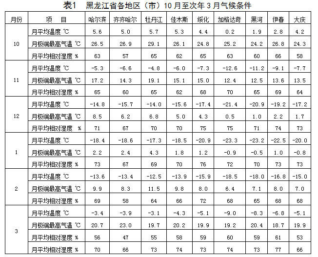 2.1.1 全省各地區(市)10月至次年3月氣候條件見表1。