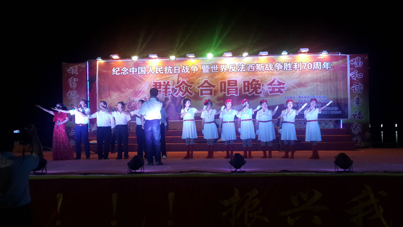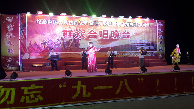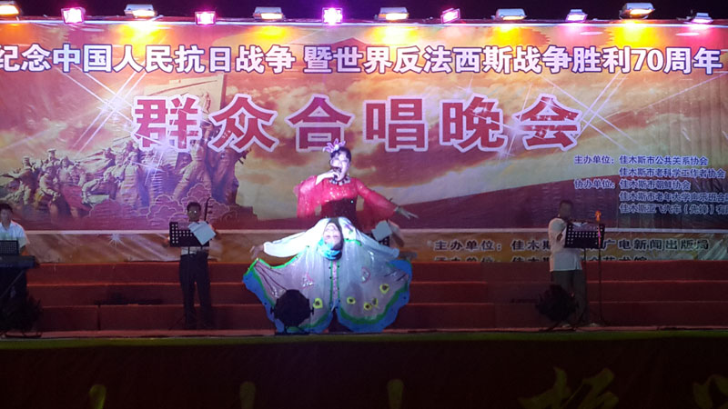 8月26日,在市外灘公園廣場,由佳木斯市老科學技術工作者協會與市公共關系協會聯合主辦,佳木斯市朝鮮族協會、佳木斯市老年大學聲樂班合唱隊、佳木斯亞飛汽車有限公司等單位協辦,舉行了紀念中國人民抗日戰爭暨世界反法西斯戰爭勝利70周年群眾合唱晚會。佳木斯市委宣傳部領導葛愛東列席觀看了演出。本場晚會是專為抗日戰爭勝利70周年量身設計的,表演了《我的家在東北松花江上》、《太行山上》、《露營之歌》、《地道戰》等多首歌頌共產黨和無產階級革命的歌曲,并由多段紀念抗戰的詩朗誦貫穿整個晚會,晚會場面宏大,氣氛熱烈。弘揚了中國革命精神,使民眾銘記歷史,緬懷先烈,愛我中華,珍惜現在的幸福生活。