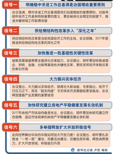 會(huì)議認(rèn)為,2017年要召開(kāi)黨的十九大,也是實(shí)施“十三五”規(guī)劃的重要一年和推進(jìn)供給側(cè)結(jié)構(gòu)性改革的深化之年,做好經(jīng)濟(jì)工作意義重大。會(huì)議字里行間的表述,傳遞出2017年我國(guó)經(jīng)濟(jì)發(fā)展六大重要信號(hào)。