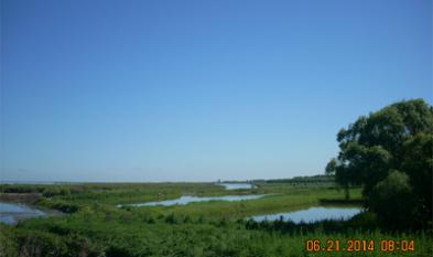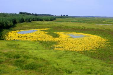另一種灘地為典型草甸,碧草茵茵,柳叢蓊郁,分布在高河漫灘和一級階地上,以中生植物為主,生長著小葉樟、烏拉苔草、修氏苔草、叢樺和沼柳等,形成了小葉樟草甸、小葉樟雜草類草甸(五花草塘)。草甸上柳叢綠草相間,溝渠河泡縱橫環繞,時聞蛙聲如鼓,常見水鳥飛翔。